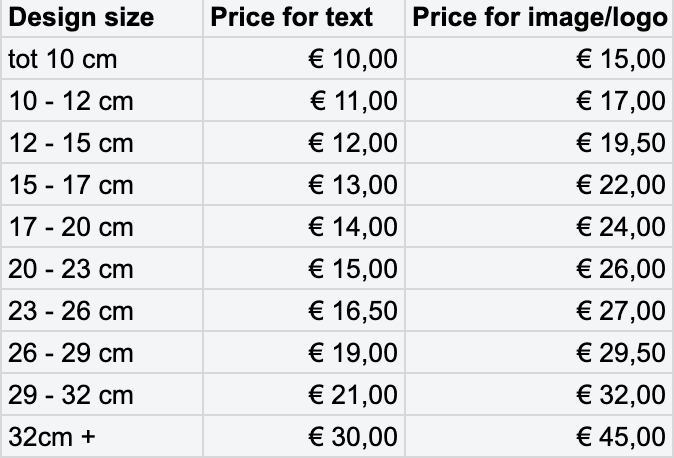 - Borduurpersonalisatie: De prijs voor gepersonaliseerde borduring hangt af van de grootte van het ontwerp en het type ontwerp (tekst of logo/afbeelding). Zie de tabel aan de linkerkant.